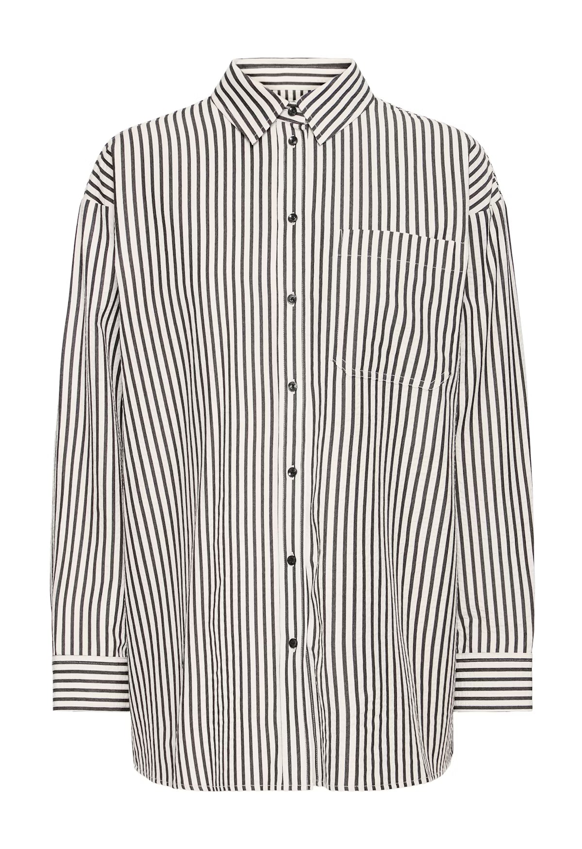 La chemise rayée présente une silhouette droite et décontractée avec un devant boutonné, un col pointu, une poche poitrine et des manches longues avec un détail de poignet visible.