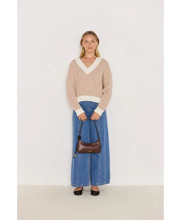 Apportez une touche de douceur à votre garde-robe avec ce pull en maille à col en V signé MINKPINK. Confectionné dans une maille côtelée beige et blanc crème, ce pull oversize offre un look à la fois décontracté et féminin. Son encolure en V profonde met en valeur le décolleté, tandis que les bords contrastants ajoutent une finition moderne. Parfait avec un jean pour un style casual chic.